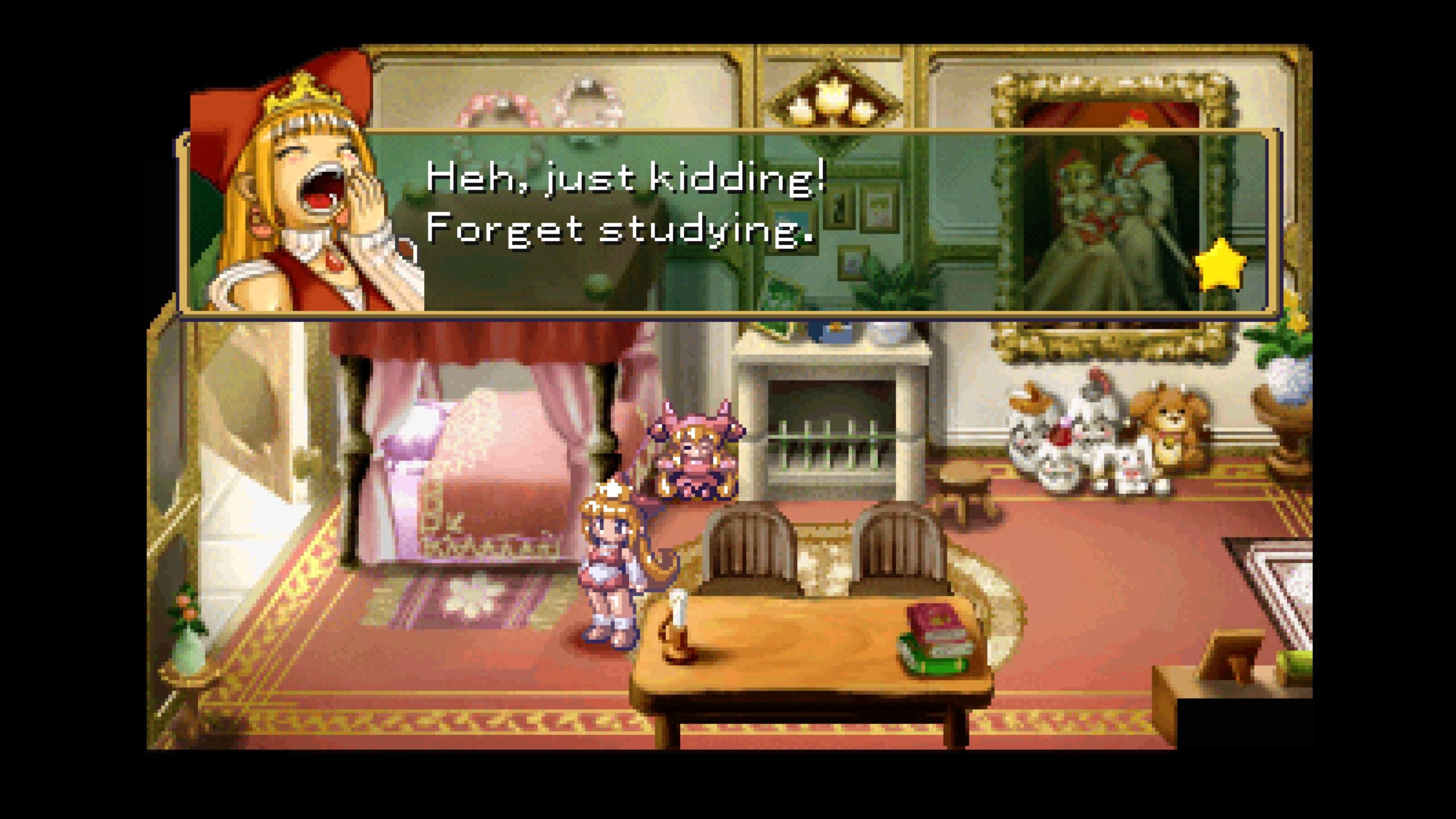 Je vais vous parler surtout de Rhapsody II, ballad of the Little Princess que je viens de finir. J’ai tellement été emballé que je ne peux attendre pour vous parler de cette compilation. Et, je l’espère, vous donner envie de jouer à ce jeu qui fait partie de la grande famille des JRPG. Dans Rhapsody II, vous suivez l’aventure de la princesse Kururu dans sa quête d’aventure et d’amour. Kururu est la fille de la princesse Cornet, qui était la protagoniste du premier jeu Rhapsody. La famille de Cornet et Kururu a la capacité de parler avec des marionnettes, qui font partie de votre équipe pendant votre aventure.