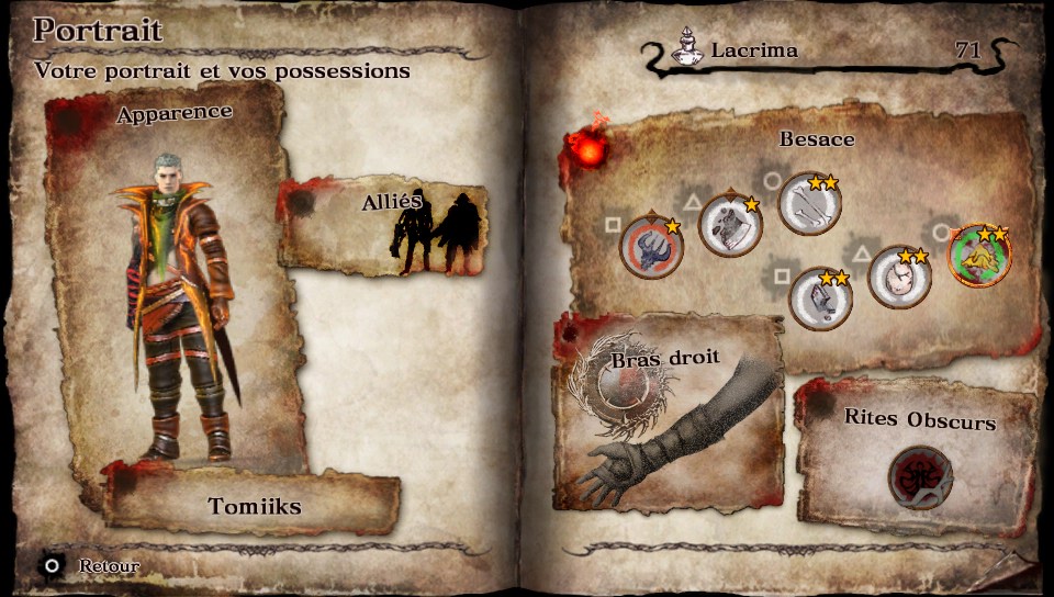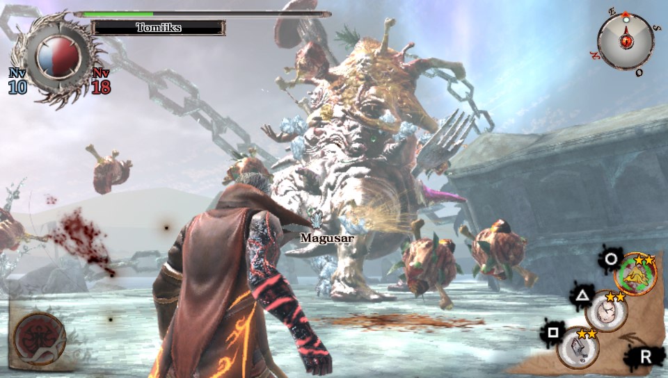 Soul sacrifice sans être une tuerie graphique propose une expérience visuelle agréable pour une console portable. Les différents menus sont lisibles et l’on comprend assez vite comment naviguer dans Librom. Ce dernier contient aussi bien les différentes missions que la fiche de personnalisation de son personnage. Chaque chapitre est découpé en mission qui se déroule dans des espaces fermés. Ces missions ont pour but soit de chasser un type de monstre soit de mettre un terme à l’existence d’un sorcier corrompu qui aurait pris une forme abjecte. Si les créatures lambda sont plutôt quelconques, un soin a été apporté aux boss qui parfois prennent tout l’écran et jouissent de nombreux détails. Idem, certains sorts en mettent plein la vue et donnent une réelle impression de puissance qui monte crescendo tout au long de l’aventure.