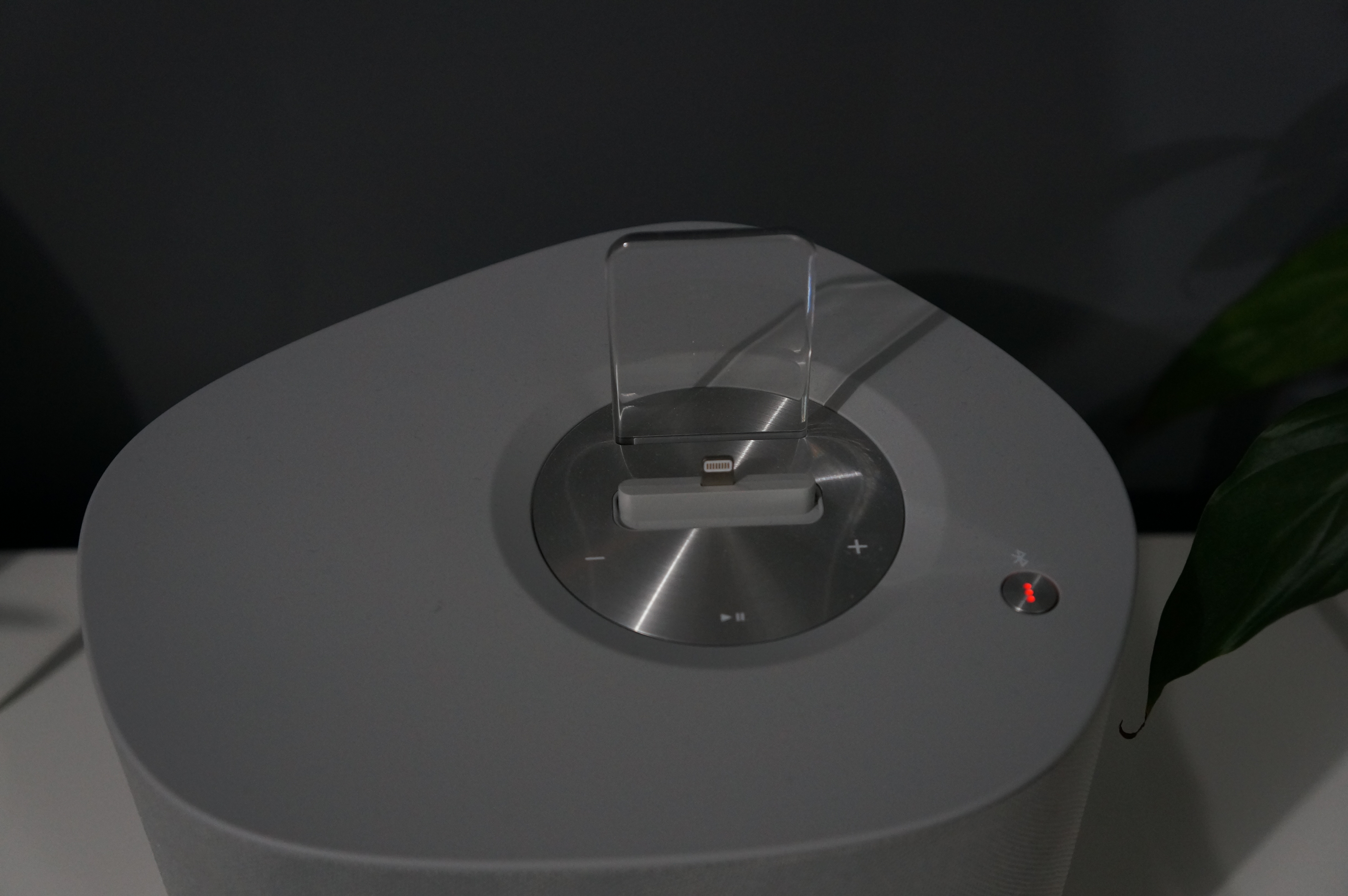 Du coté de la connectique, on retrouve avec un dock disposant d’un port lightning pour iPhone 5 et 5S. Attention la forme incurvée sur le dessus ne permet pas d’y connecter un iPad mini, dommage. Evidemment le port lightning permet non seulement de jouer les musique contenu sur l’iPhone mais aussi de le recharger (charge and play).