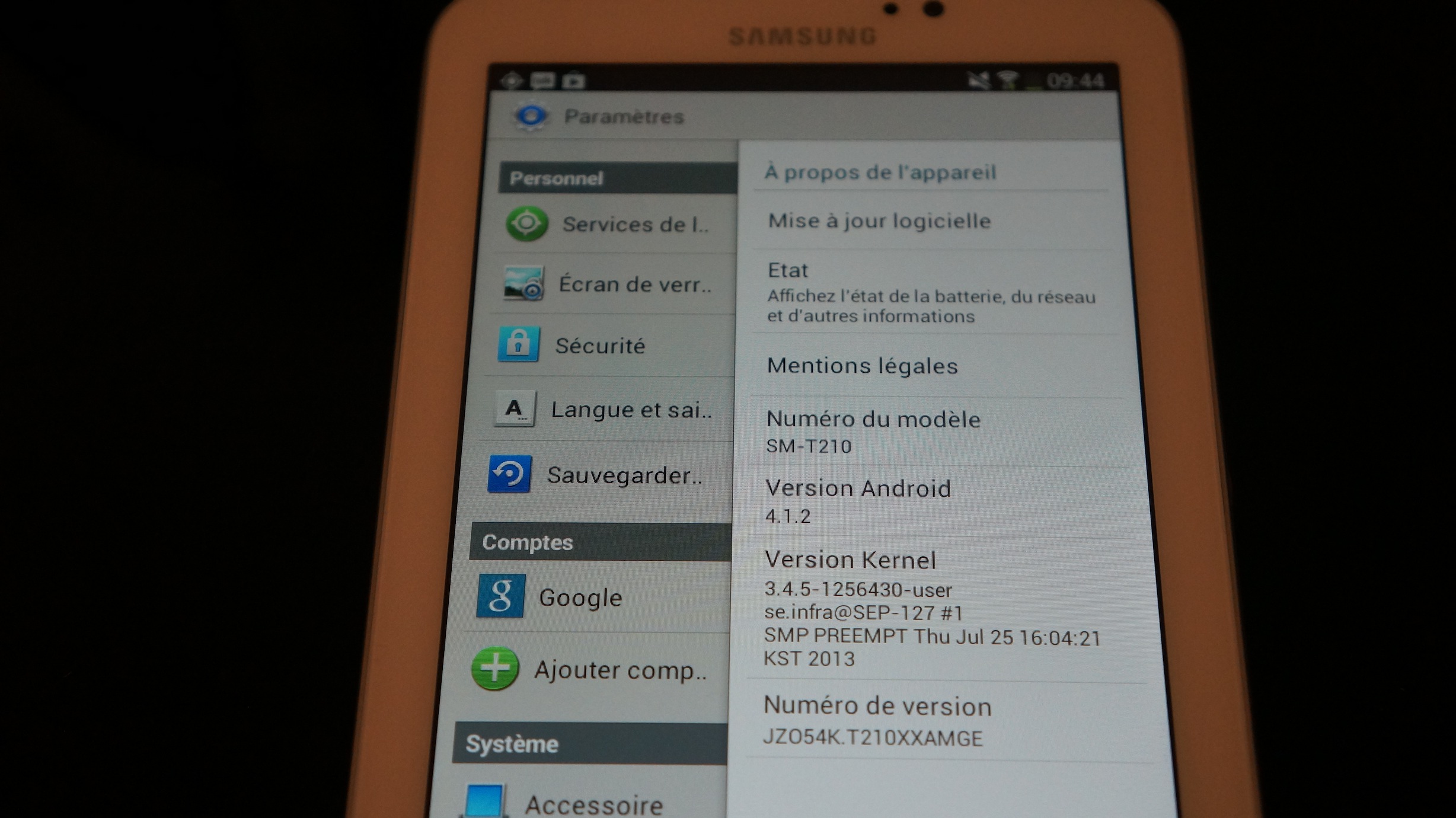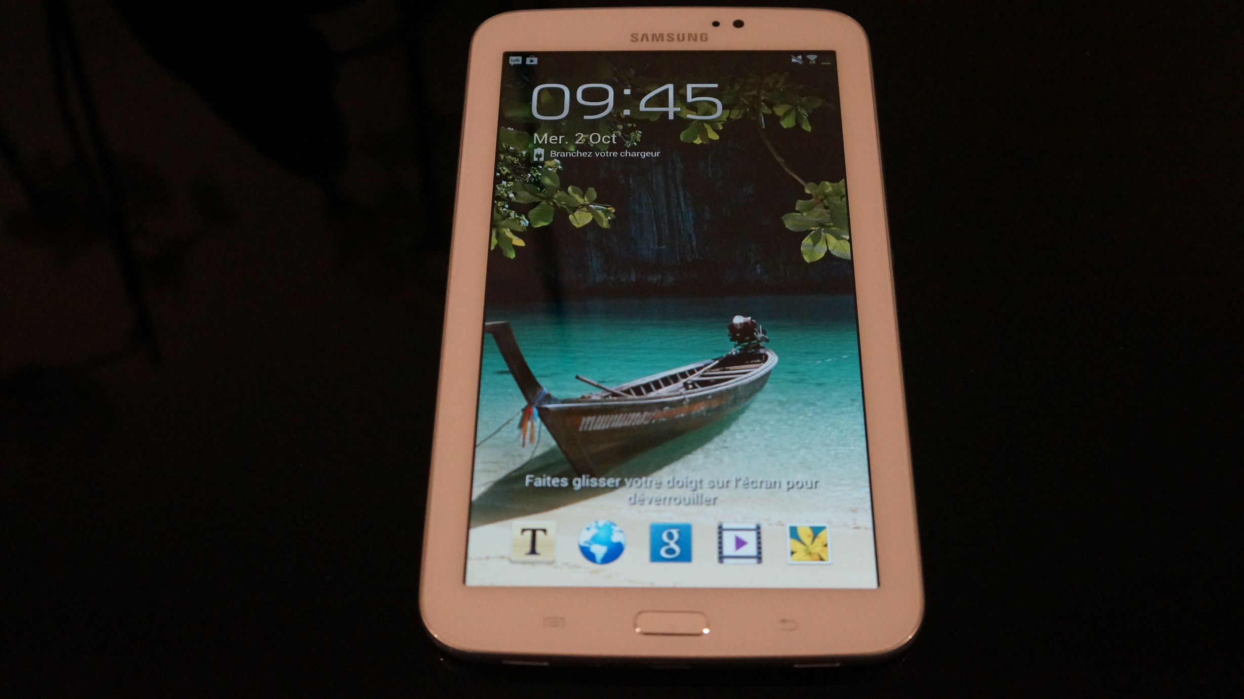 Comme on peut le constater, la tablette tourne une version assez ancienne d’Android, la 4.1.2 sortie en juillet 2012. Néanmoins c’est la version actuellement la plus déployée sur le parc Android (stats septembre 2013). On retrouve sur la tablette la surcouche Samsung habituelle nommé TouchWiz. Il s’agit de la version TouchWiz Nature UX 2.0 qui est apparue pour la première fois avec la sortie du Samsung Galaxy S4. Elle apporte une interface différente de celle proposée en natif par Google ainsi qu’un set d’applications Samsung proposant tout un tas de services pour accompagner les utilisateurs.