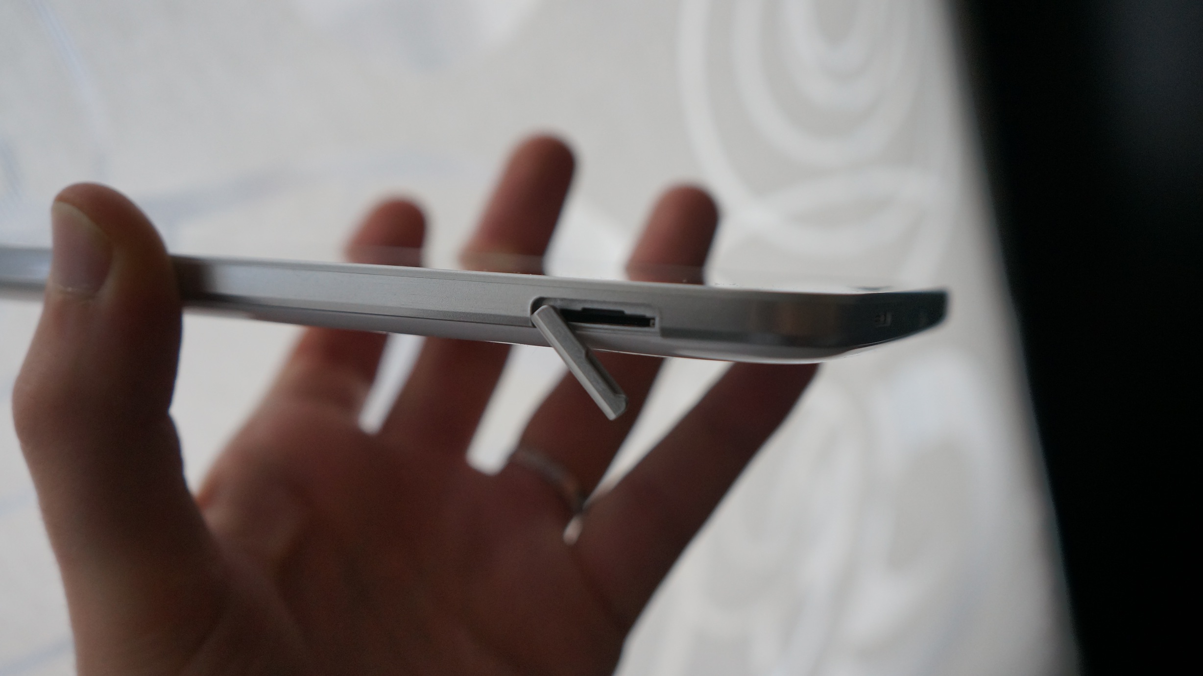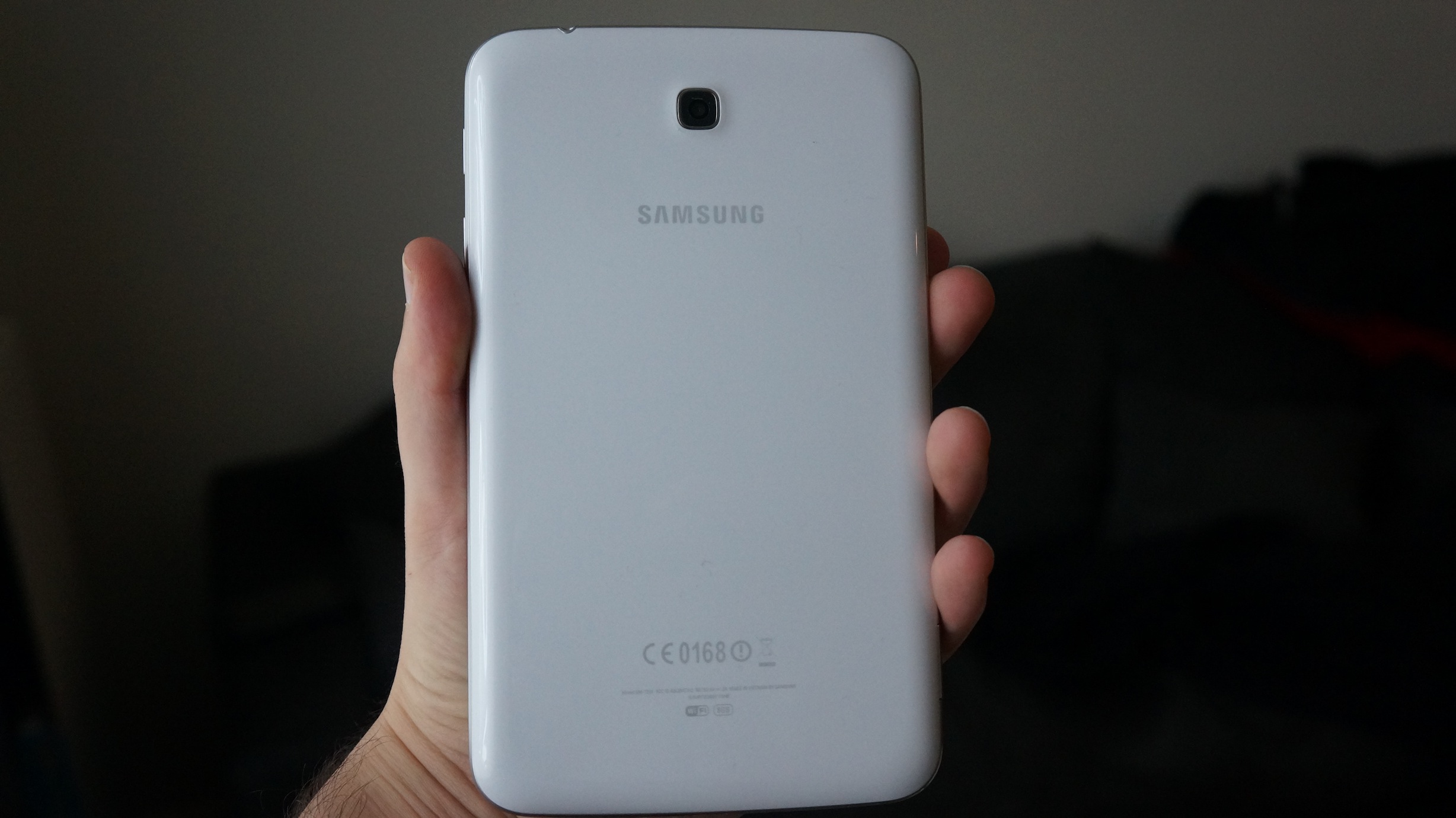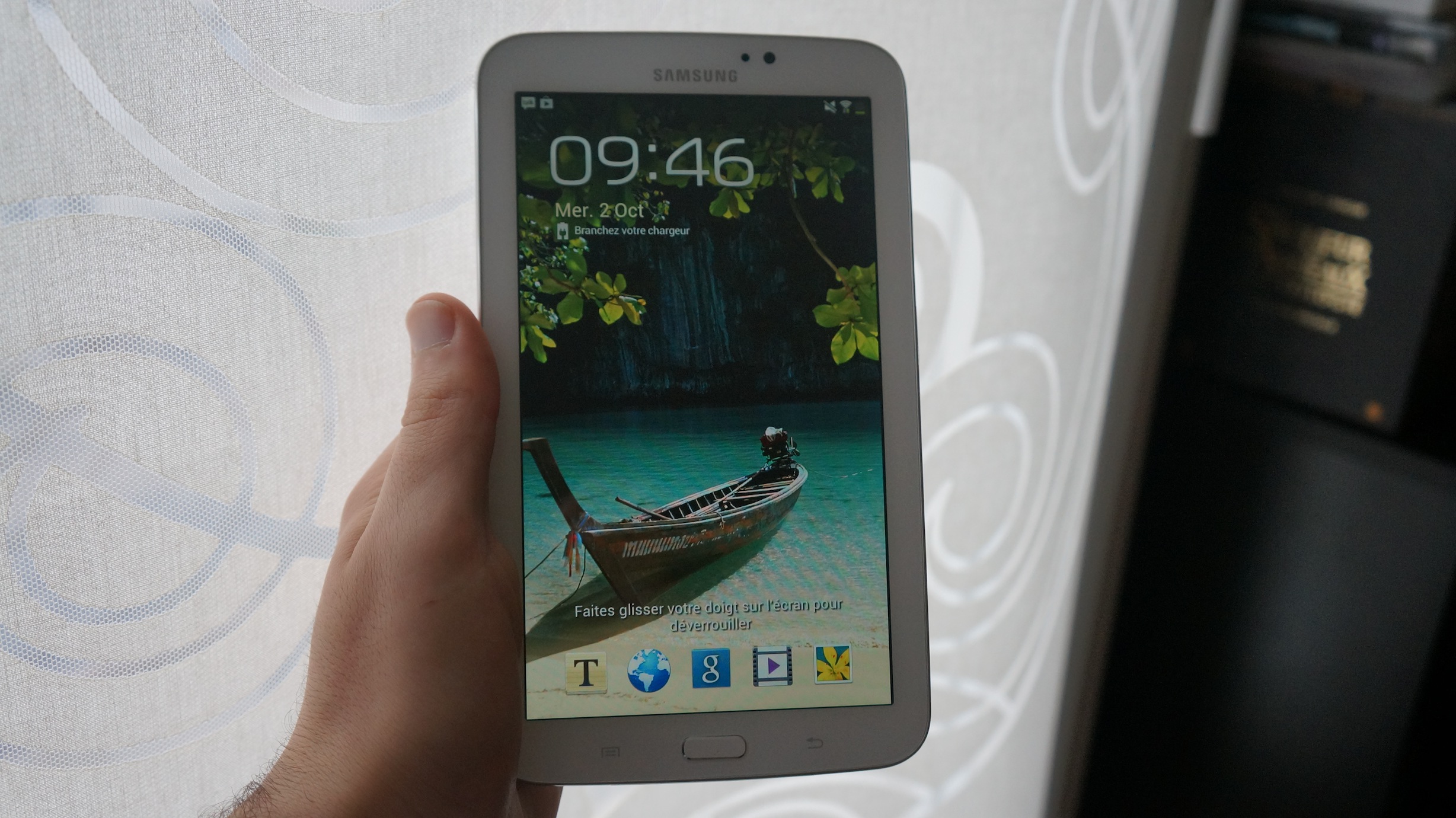 La prise en main est plutôt agréable. On peut la tenir d’une main et naviguer de l’autre sans se fatiguer au bout de trente secondes. On retrouve le plastique habituel de Samsung sur le dos de la tablette. Le fait que la tablette soit blanche masque les traces de doigts à l’arrière et ce n’est pas plus mal. Le design est plutôt épuré et en ce sens cela me plait. On retrouve un bouton centrale physique entouré de deux boutons « virtuels » qui réagissent lorsque la tablette est sous tension. On retrouve la prise de recharge, les hauts-parleurs et le micro en bas tandis que la prise jack se situe sur le dessus. A noter que la Galaxy Tab 3 dispose d’un appareil photo sur le dos et d’une webcam en frontal. Enfin, point très important, un slot pour une carte microSD est présent sur le coté.