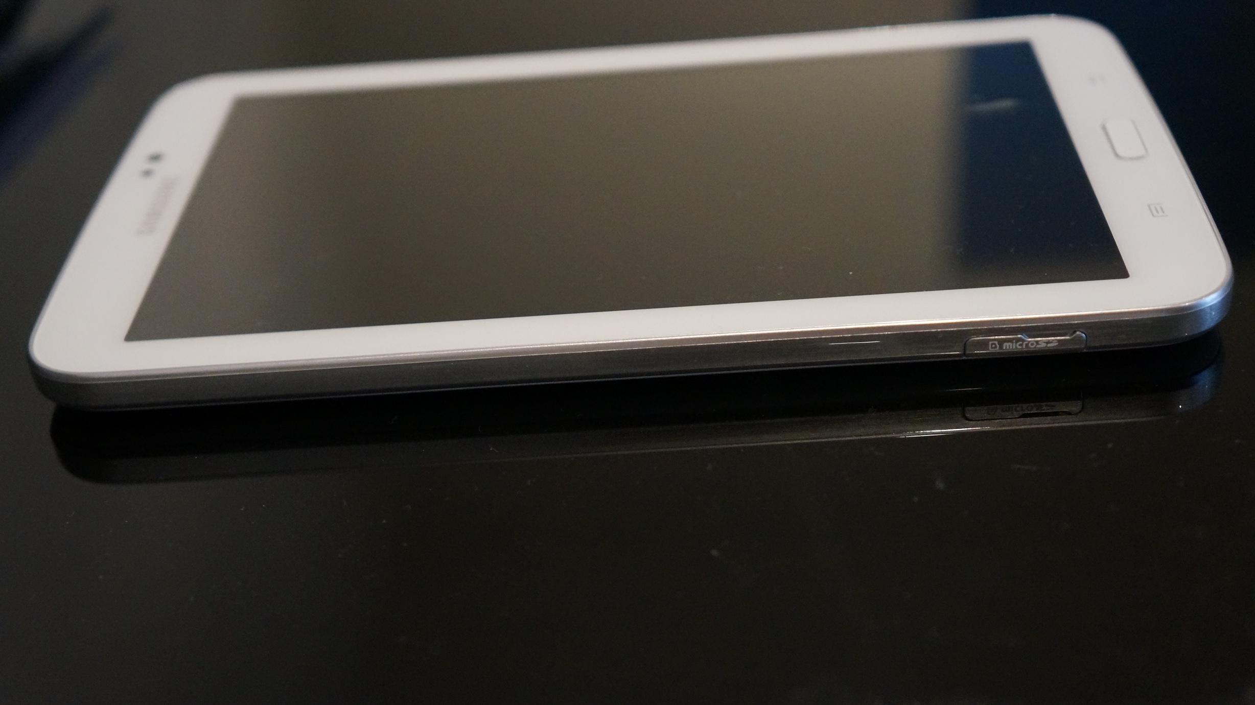 A l’utilisation je la trouve un peu moins rapide que sur un S4, normal me direz-vous le S4 est bien plus puissant. Attention, je ne dis pas que ce n’est pas fluide, mais j’ai plutôt une impression de lenteur tout relative en passant entre les différents écrans. Par contre, gros point positif pour la Galaxy tab 3 7.0, c’est le port microSD dont elle dispose. Celui permet d’augmenter son espace de stockage pour quelques euros. Pour moins de 10 € il est donc possible d’ajouter une carte mémoire 16 Go et donc de passer à 14 Go (la tablette dispose de 8 Go de base). Contrairement à la Nexus 7, on pourra donc remplir de musiques, films, jeux, sa tablette.
