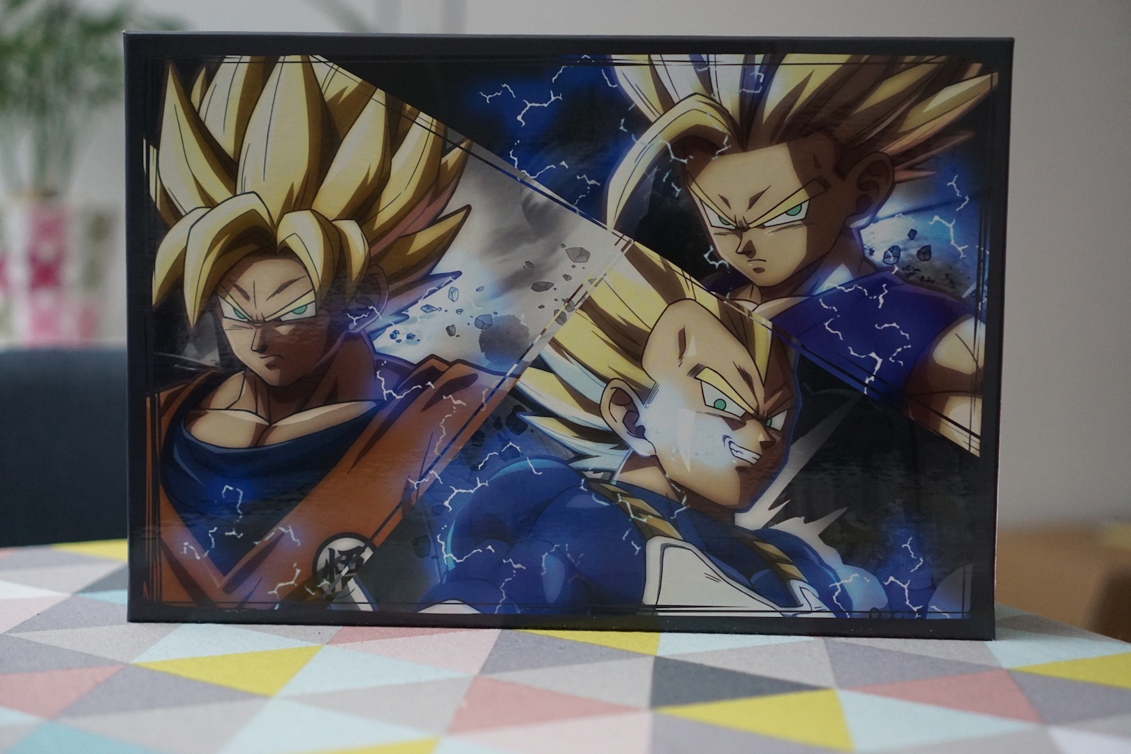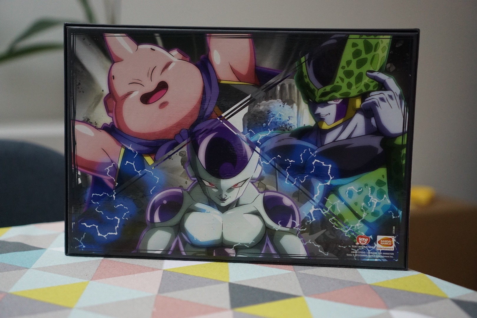 La boîte était plus légère que ce à quoi je m’attendais. Elle est protégé par un carton avec de part et d’autres nos trois guerriers Z, Goku, Vegeta et Gohan ado tandis que de l’autre côté on retrouve les trois bad guys qui ont fait la légende de Dragon Ball Z à savoir Freezer, Cell et Majin Buu !