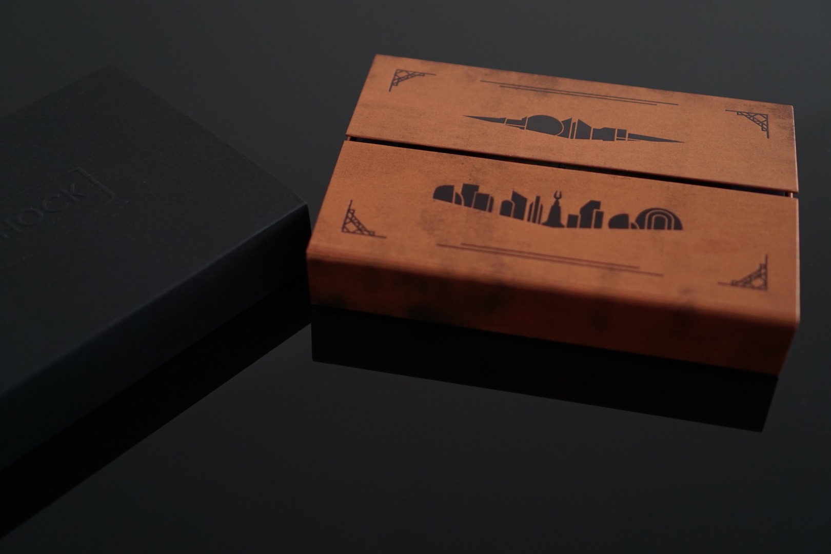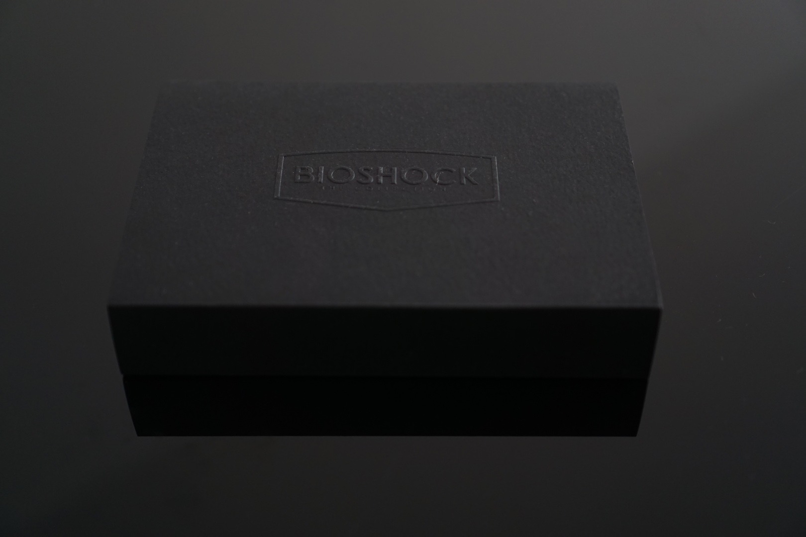 D’autant plus que celui-ci est limité à 500 exemplaires. Je possède d’ailleurs le numéro 345/500. Bon, cessons les effusions de joie et voyons voir ce que contient ce Press Kit de Bioshock The Collection. Une petite boite se cache sous un fourreau noir. Sur le dessus, on y devine une représentation de Rapture la cité noyée et de Columbia la cité dans le ciel.