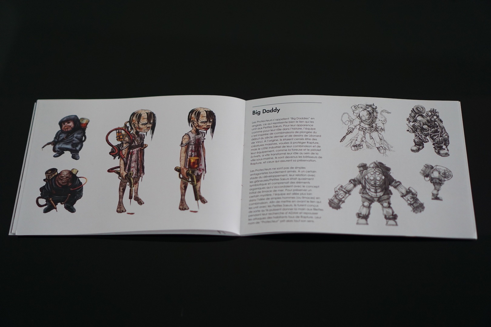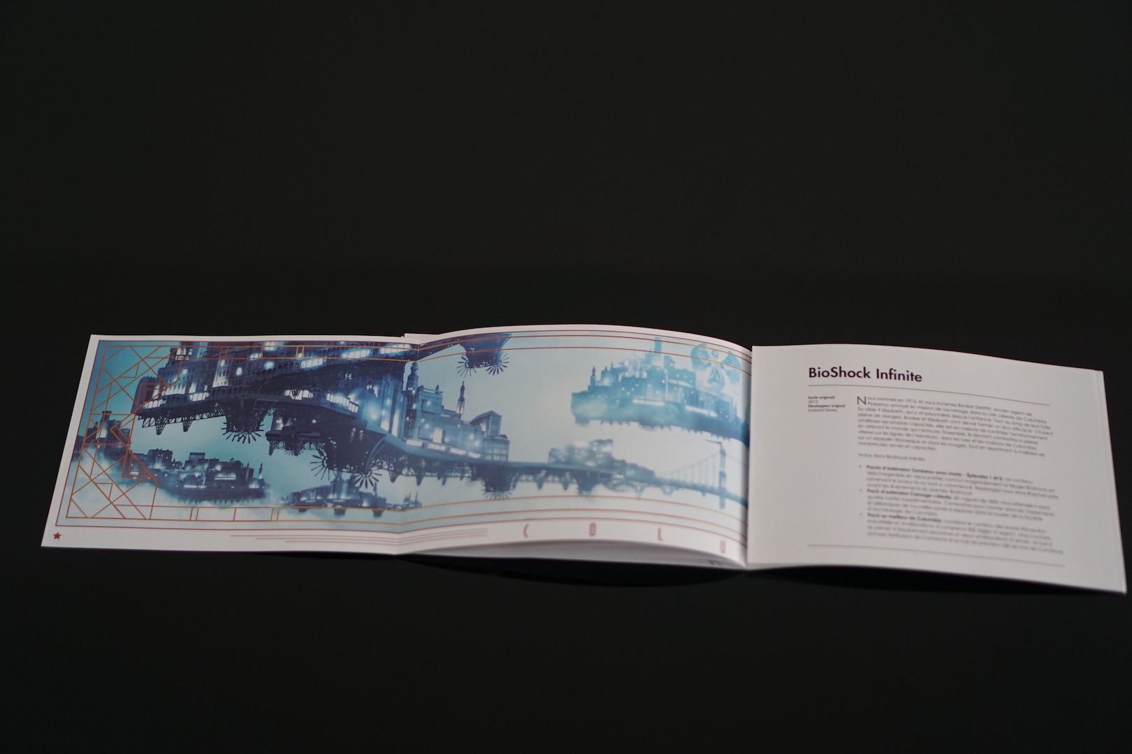 En ouvrant la boite, on découvre deux illustrations sur les rabats intérieurs. C’est confirmé, il s’agit bien de Rapture et Columbia. On y découvre également un petit dossier presse sur Bioshock The Collection qui rassemble un remaster PS4 des trois premiers épisodes.
